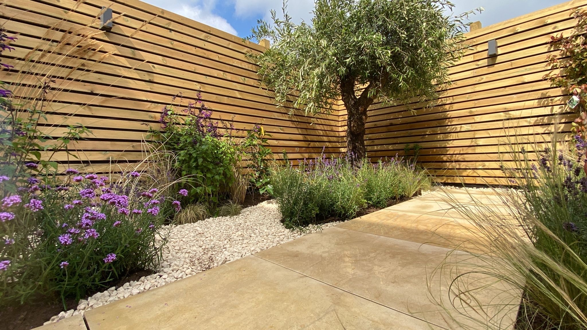 The Elm Tree project transformed a neglected garden into a cottage-inspired haven with a sandstone patio, pergola, wildlife planting, water bowls, and bay trees.