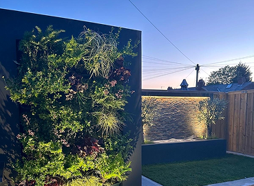 The Stockton Heath project transformed a tired garden into a modern outdoor living space with a patio, outdoor kitchen, water feature, and living wall.