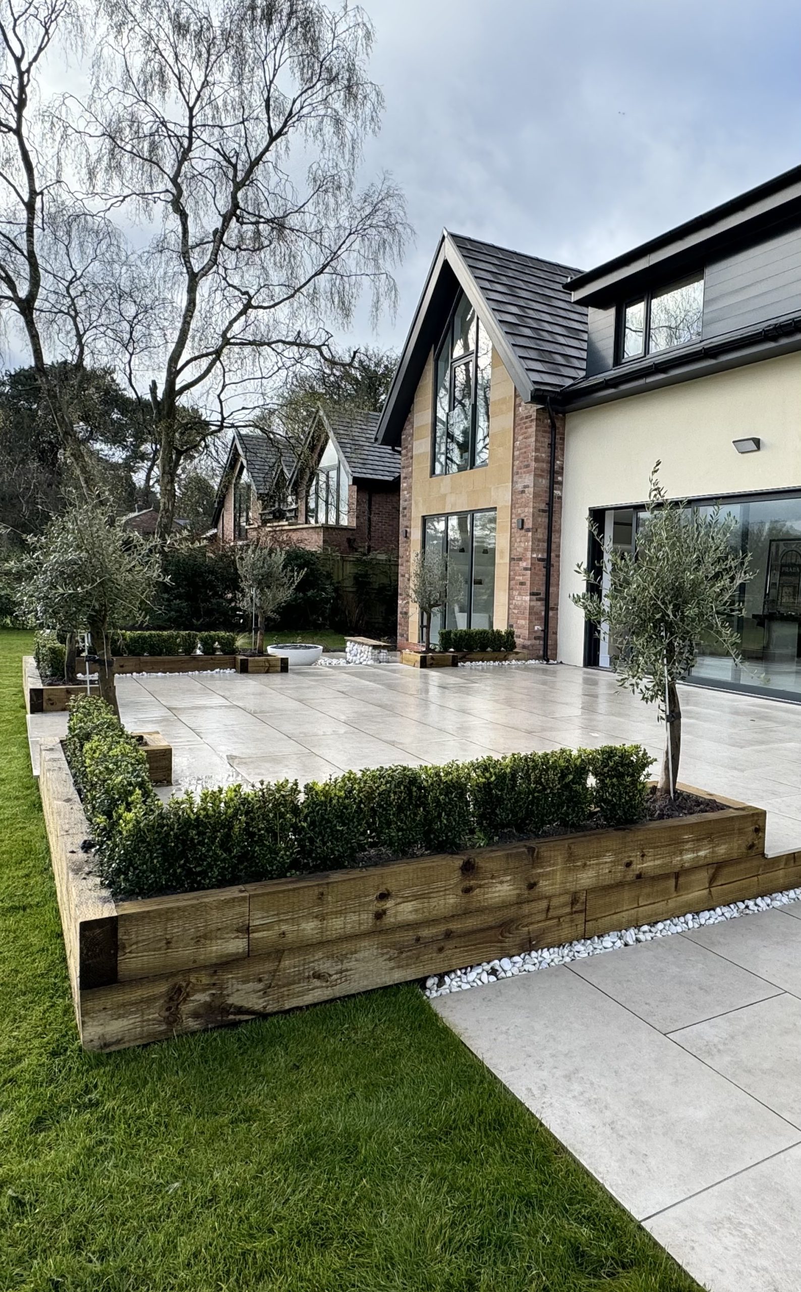 The Woodside project transformed a Cheshire property into a luxury outdoor space with porcelain paving, a fire pit seating area, Buxus hedging, and elegant planting.