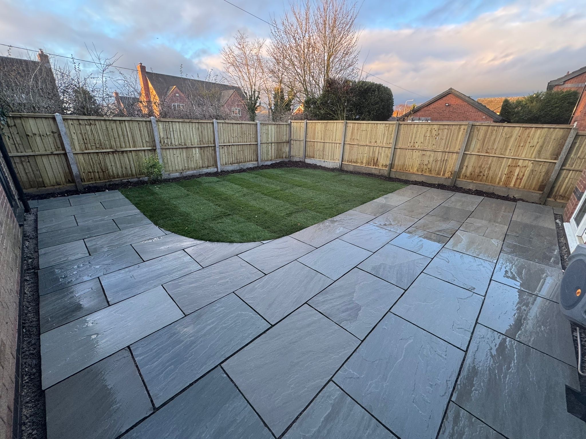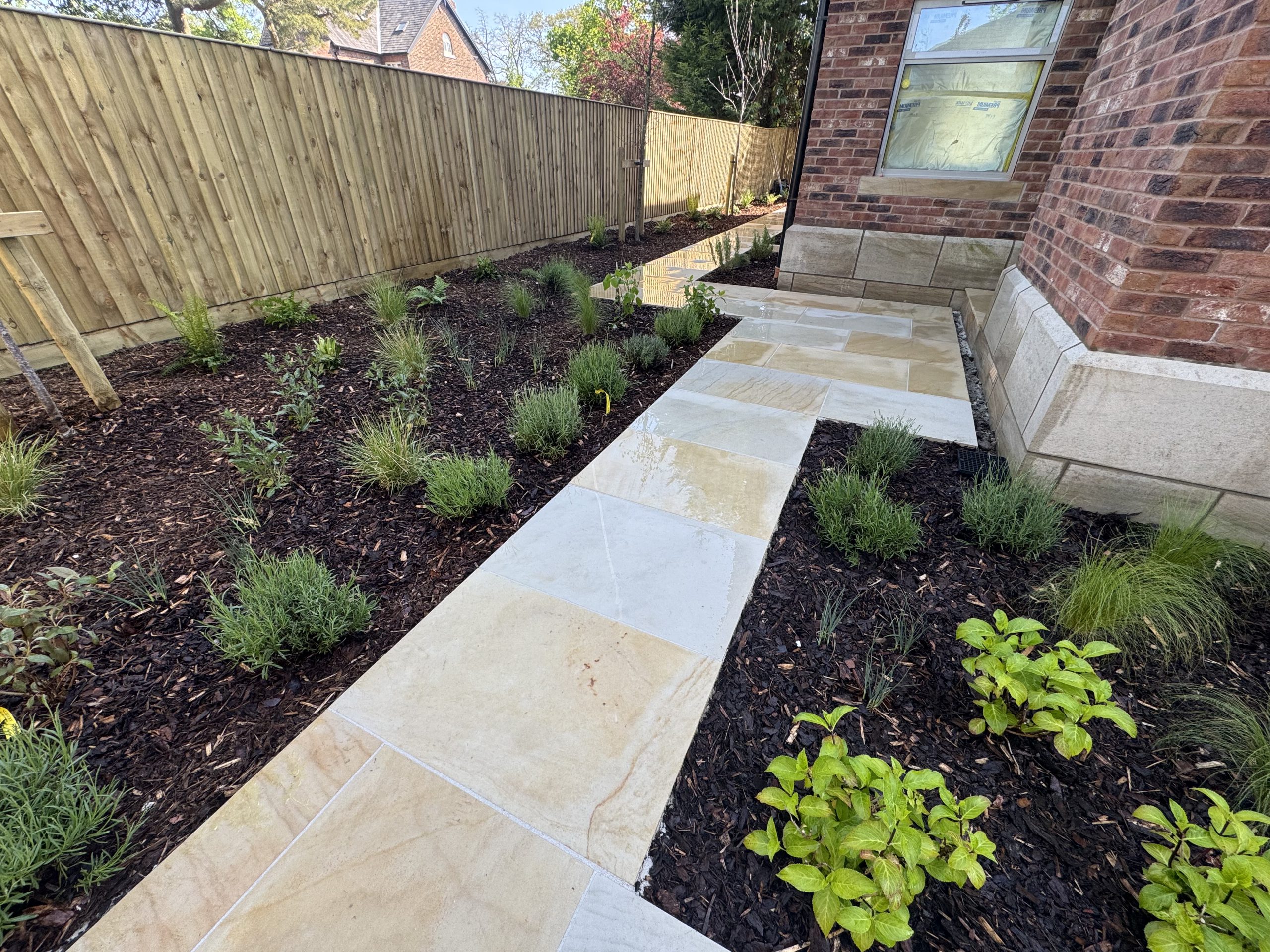 The Bowkers Croft project transformed a neglected garden into a sophisticated, low-maintenance space with a sandstone patio, fresh lawns, and elegant planting.