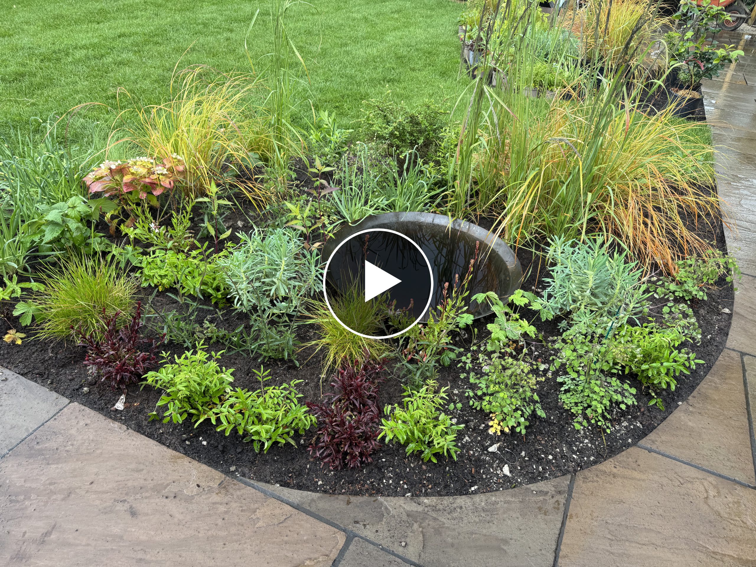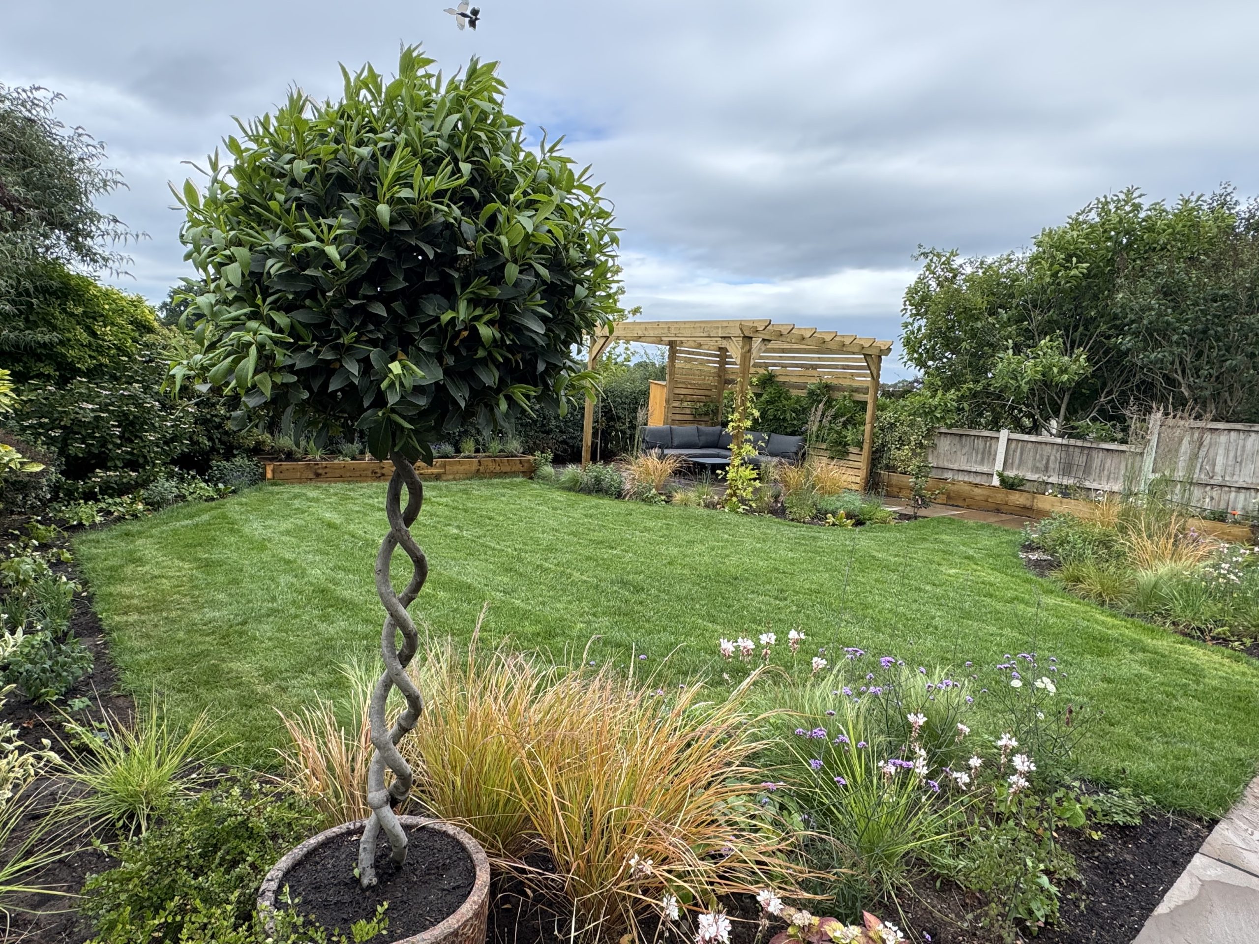 A new seating area, surrounded by large borders filled with pollinator-friendly plants, ensures year-round interest with winter bloomers, evergreens, and summer delights, complemented by ornamental grasses. Two corten steel water bowls enhance wildlife appeal and garden structure, while raised sleeper planters and a lush new lawn complete the transformation, accented by three stunning twisted bay trees.