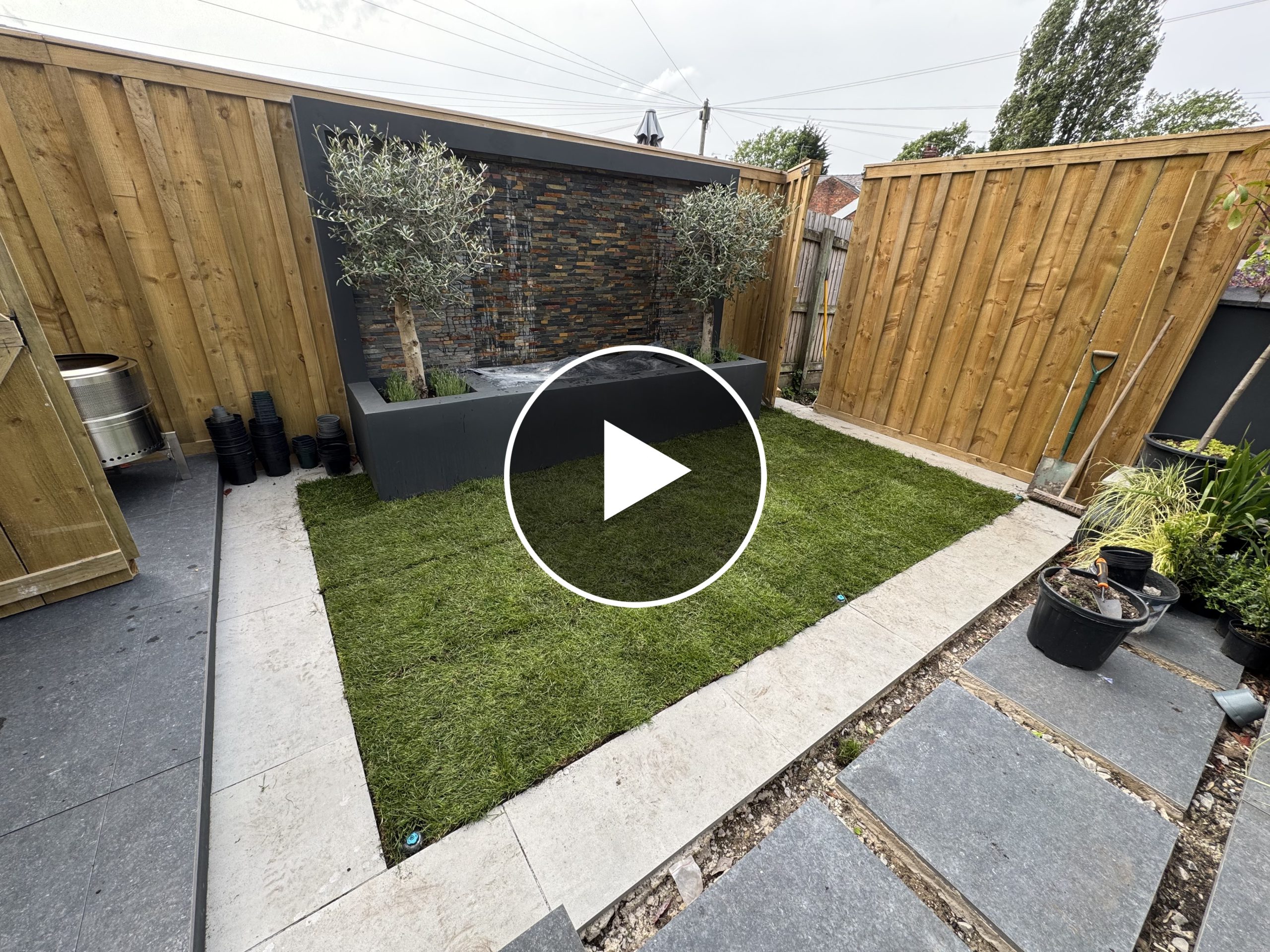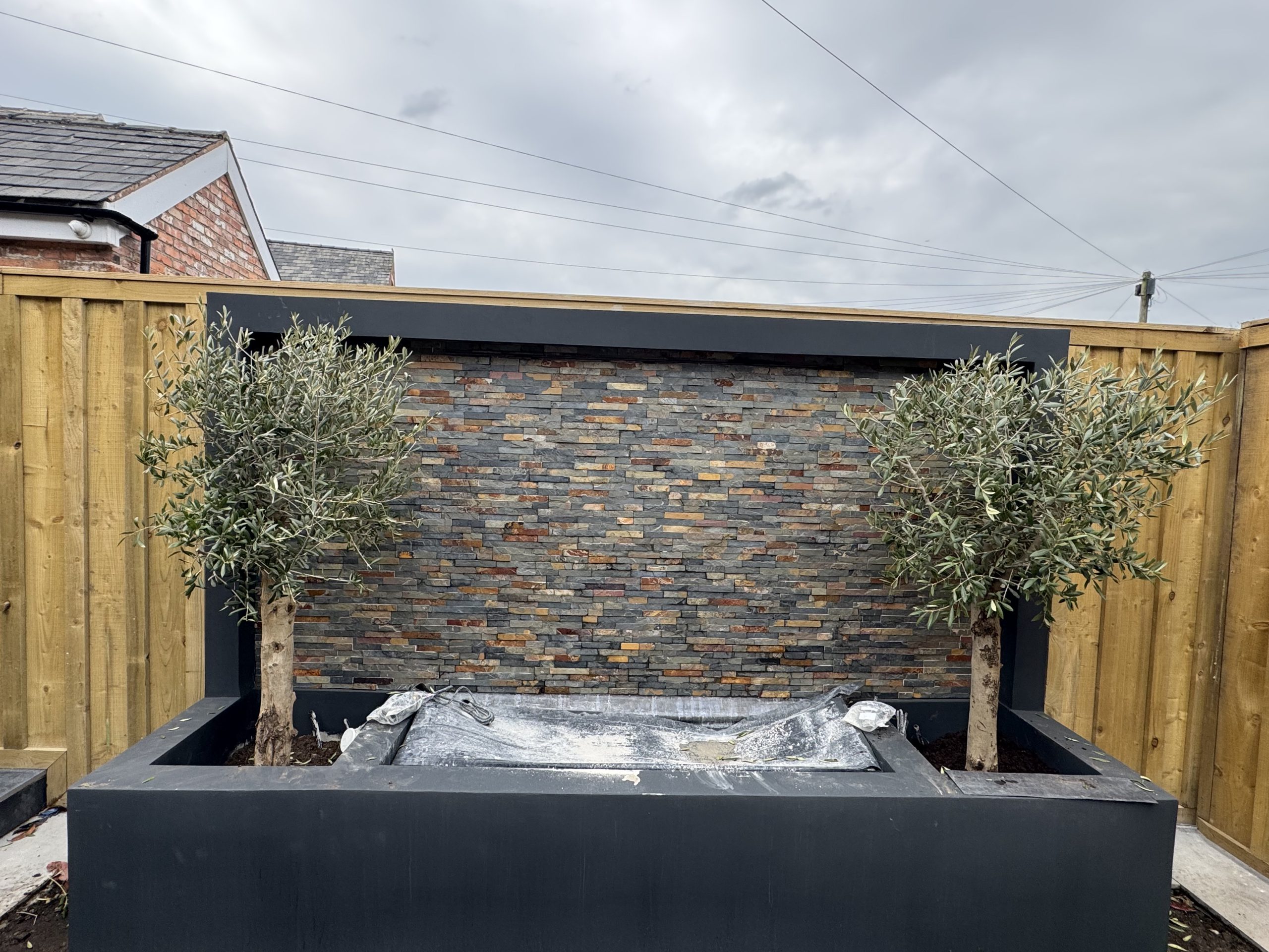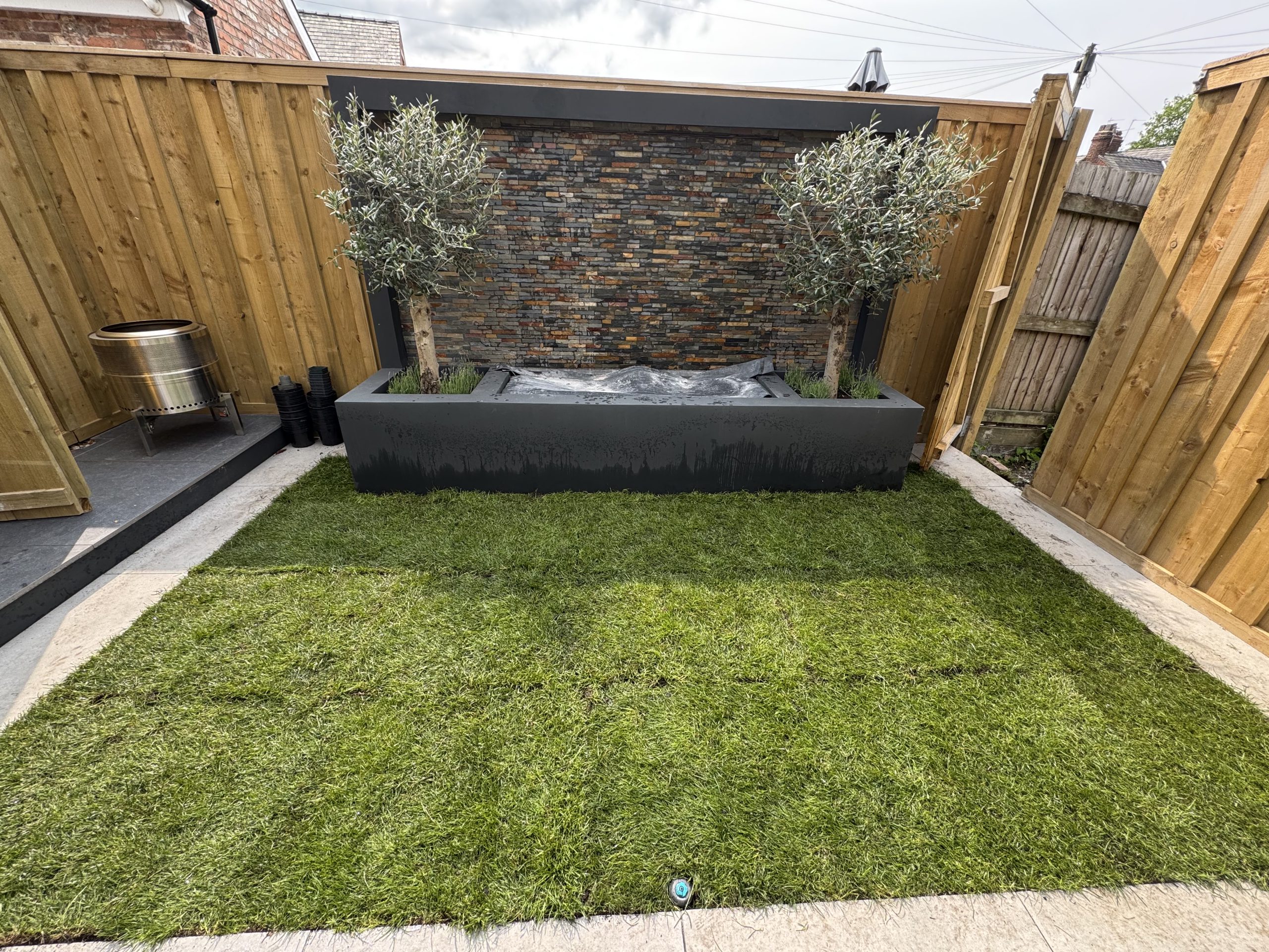 The Stockton Heath project, with a budget of £40,000, was a bespoke garden transformation designed by Fred and his family, which our team successfully brought to life. The garden features a large entertaining patio area with rendered walls and built-in planting beds, leading to a lush lawn positioned at the bottom of a stunning water feature that houses two Chelsea olive trees.